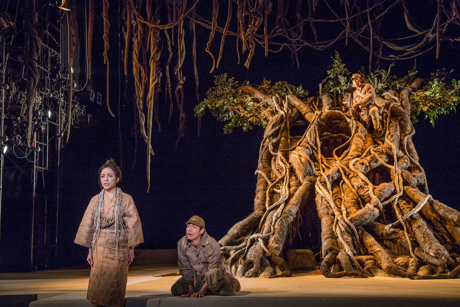 舞台いっぱいにセッティングされたガジュマルの大木を上り下りしながら進んでいく二人の兵士の会話劇と精霊の“語る女“。南の島に吹く湿度を帯びた熱い風や匂いさえ漂ってくるような世界に引き込まれます。